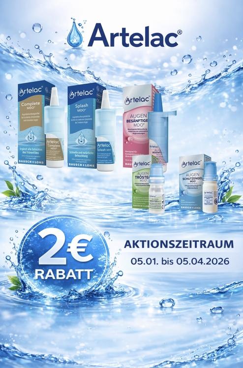 2€ Rabatt beim Kauf von Artelac Augentröster MDO, Artelac Augenschutzengel, Artelac Augenbesänftiger MDO, Artelac Complete MDO oder Artelac Splash MDO